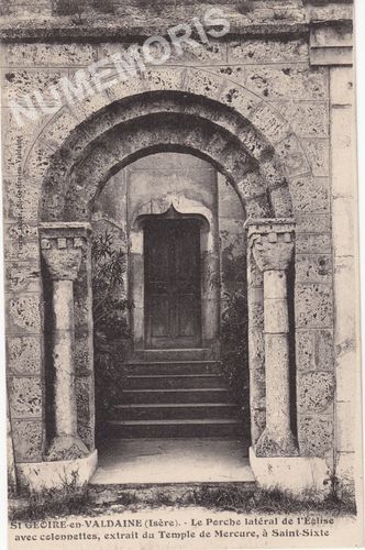 St Geoire-en-Valdaine (Isère) le Porche latéral de l'Eglise avec colonettes, extrait du temple de Mercure, à Saint-Sixte